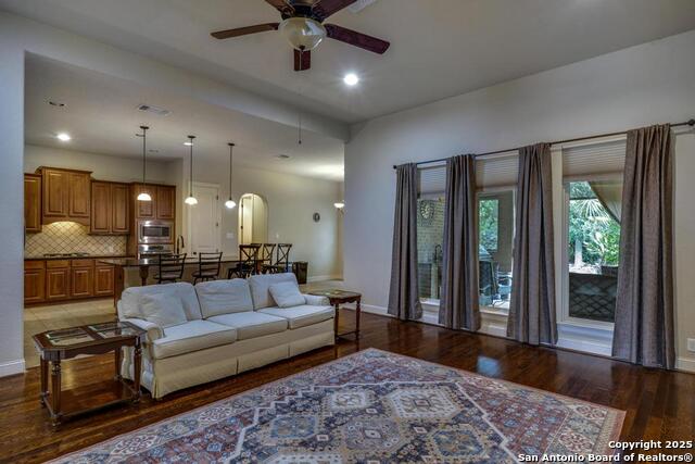DescriptionMotivated Seller! Amazing price on exceptional one story home set on over half an acre, offering solar panels and serene views from every room. The open, flexible floor plan features floor to ceiling windows, wood floors throughout the main living areas, and a spacious family room with a gas start rock fireplace. The chef's kitchen impresses with a five burner gas cooktop, custom cabinetry, stainless steel appliances, and a large island with bar seating. Enjoy dual primary suites, including one with a jacuzzi tub and a double walk through shower. Step outside to a large covered patio with an outdoor kitchen complete with a built in gas grill, fireplace, sink, and fridge perfect for entertaining. Additional highlights include epoxy flooring in the 3 car garage and water softener.